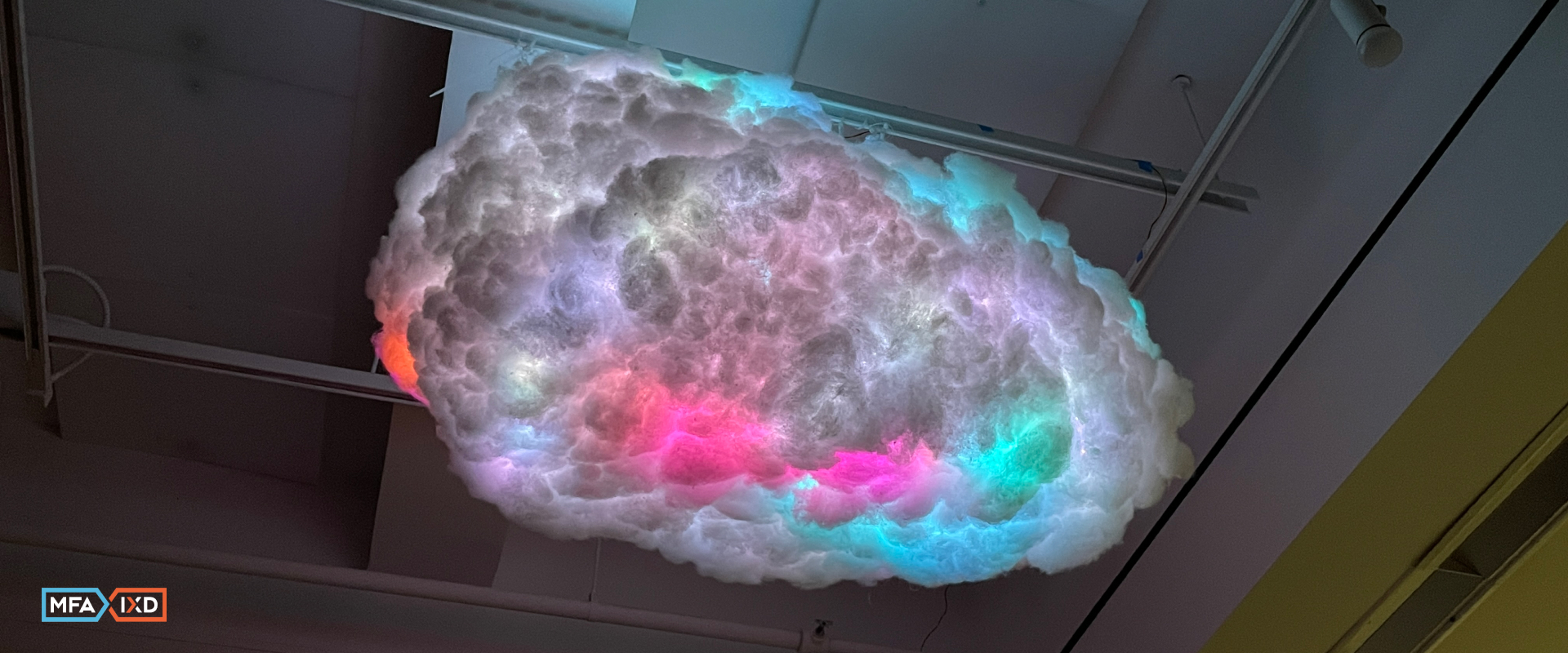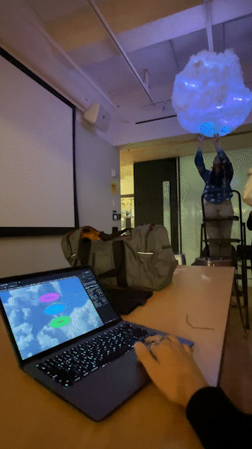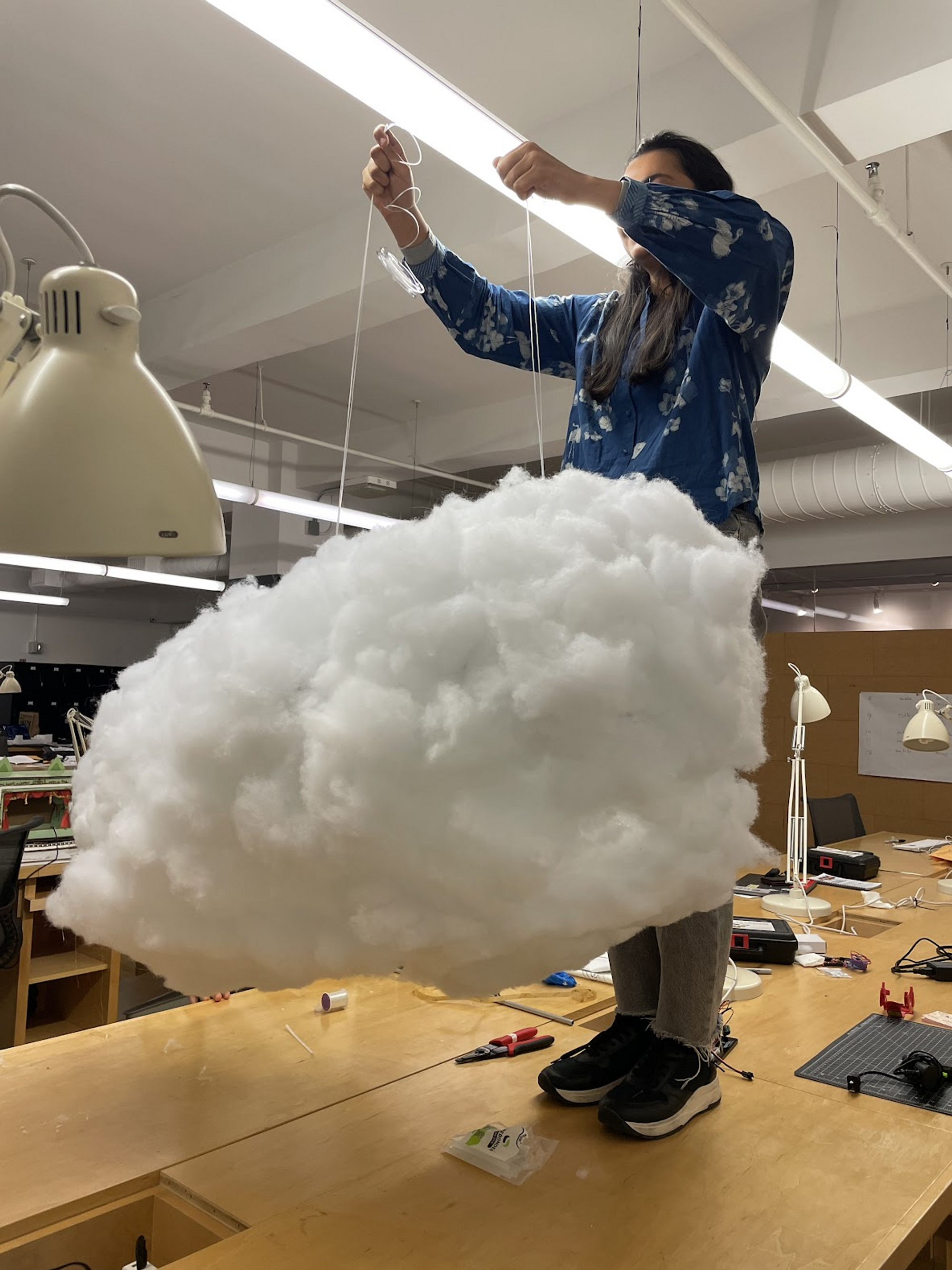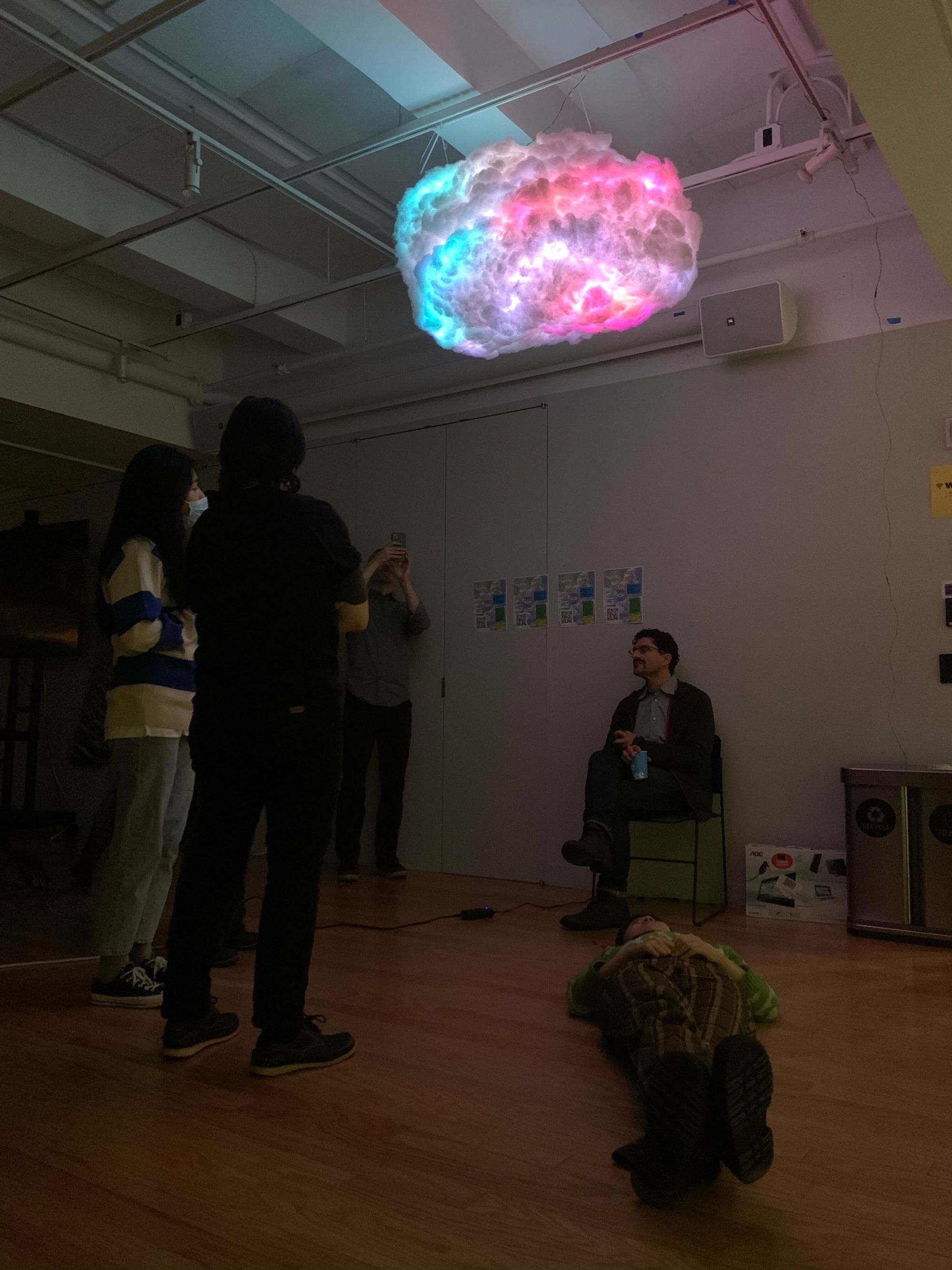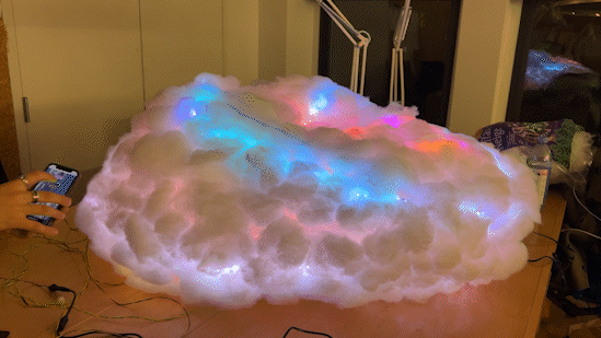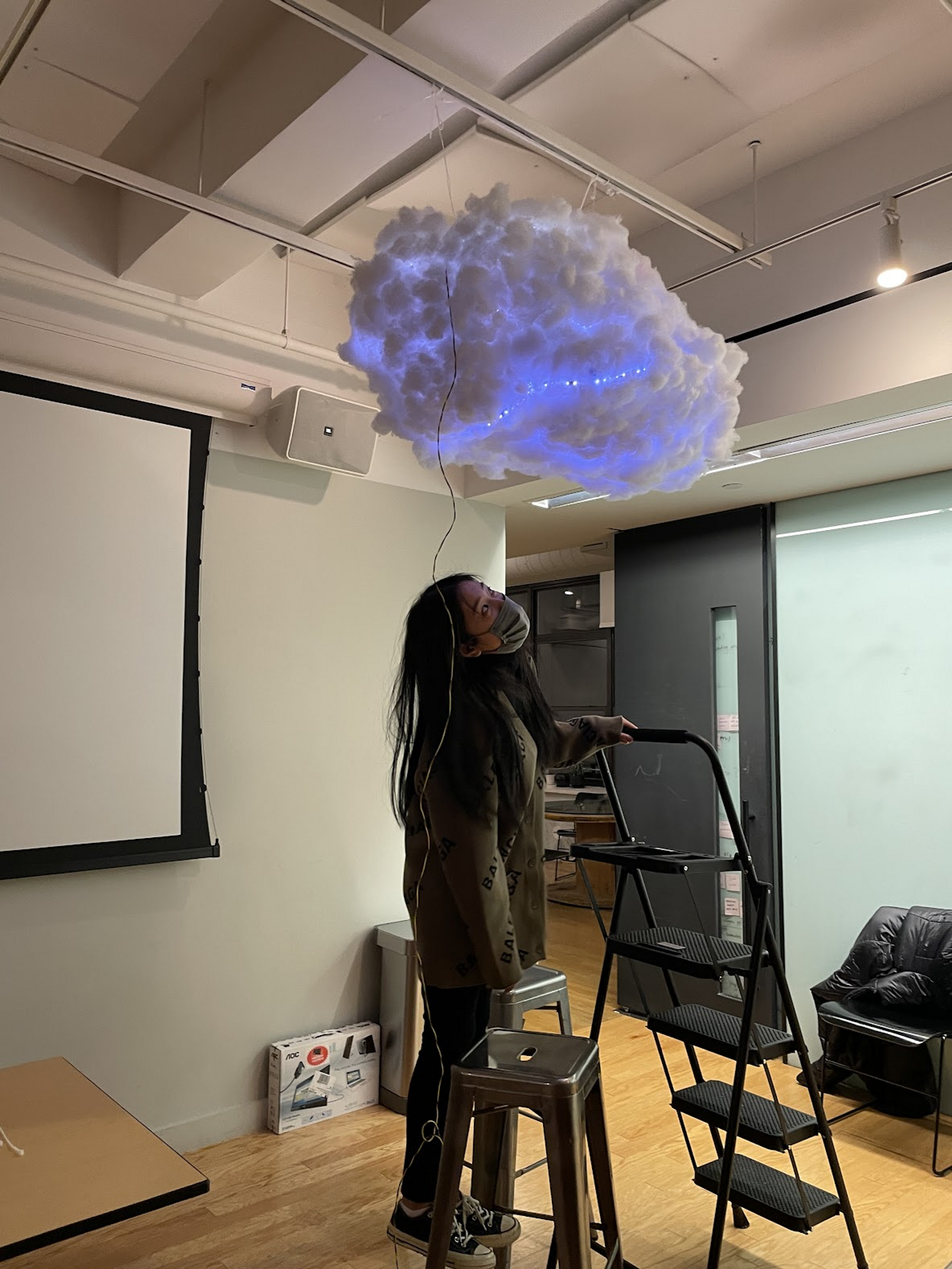 After checking the code, the LED strips, and the brightness, we hung the cloud on the ceiling using cable ties and display straps.