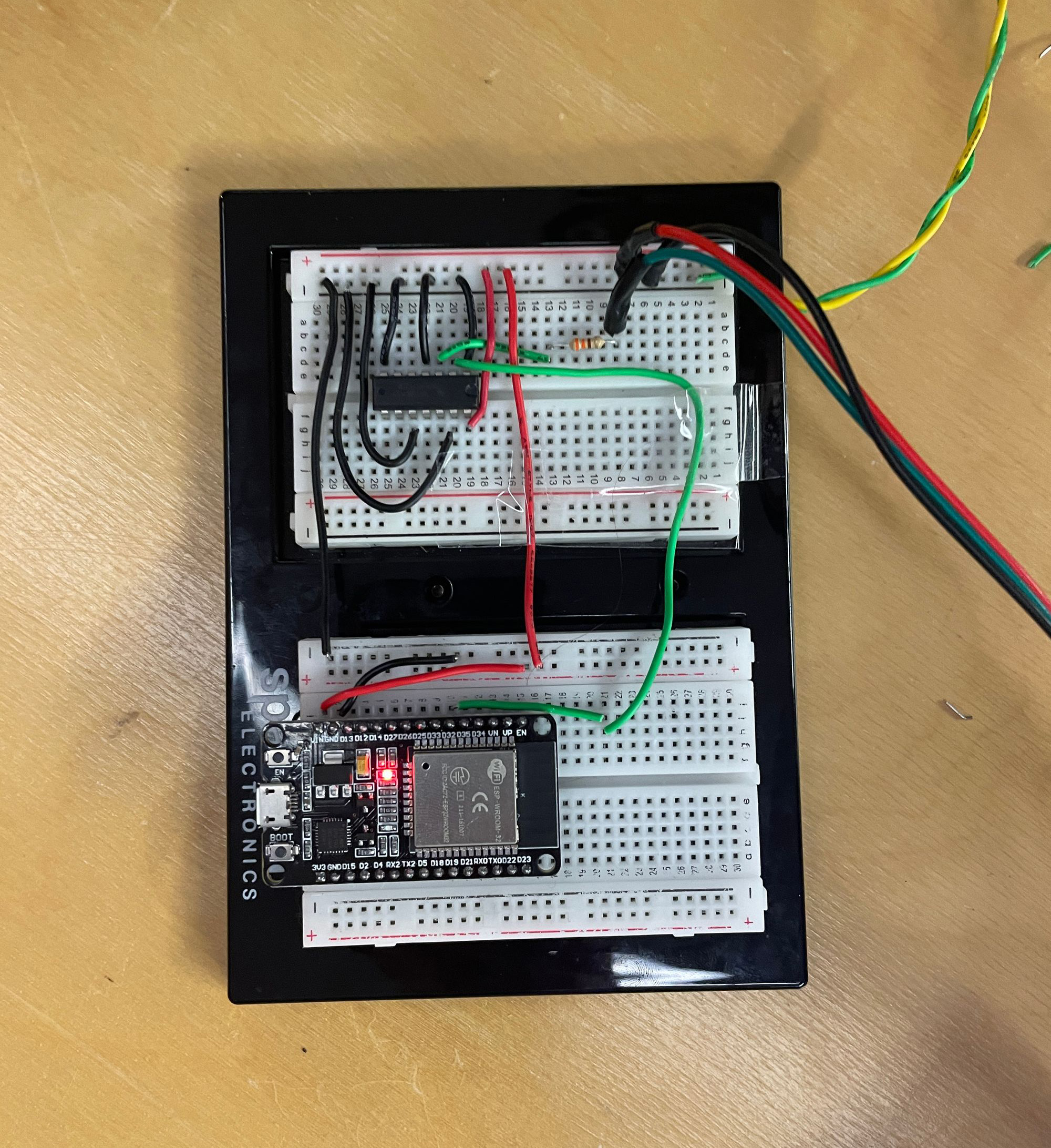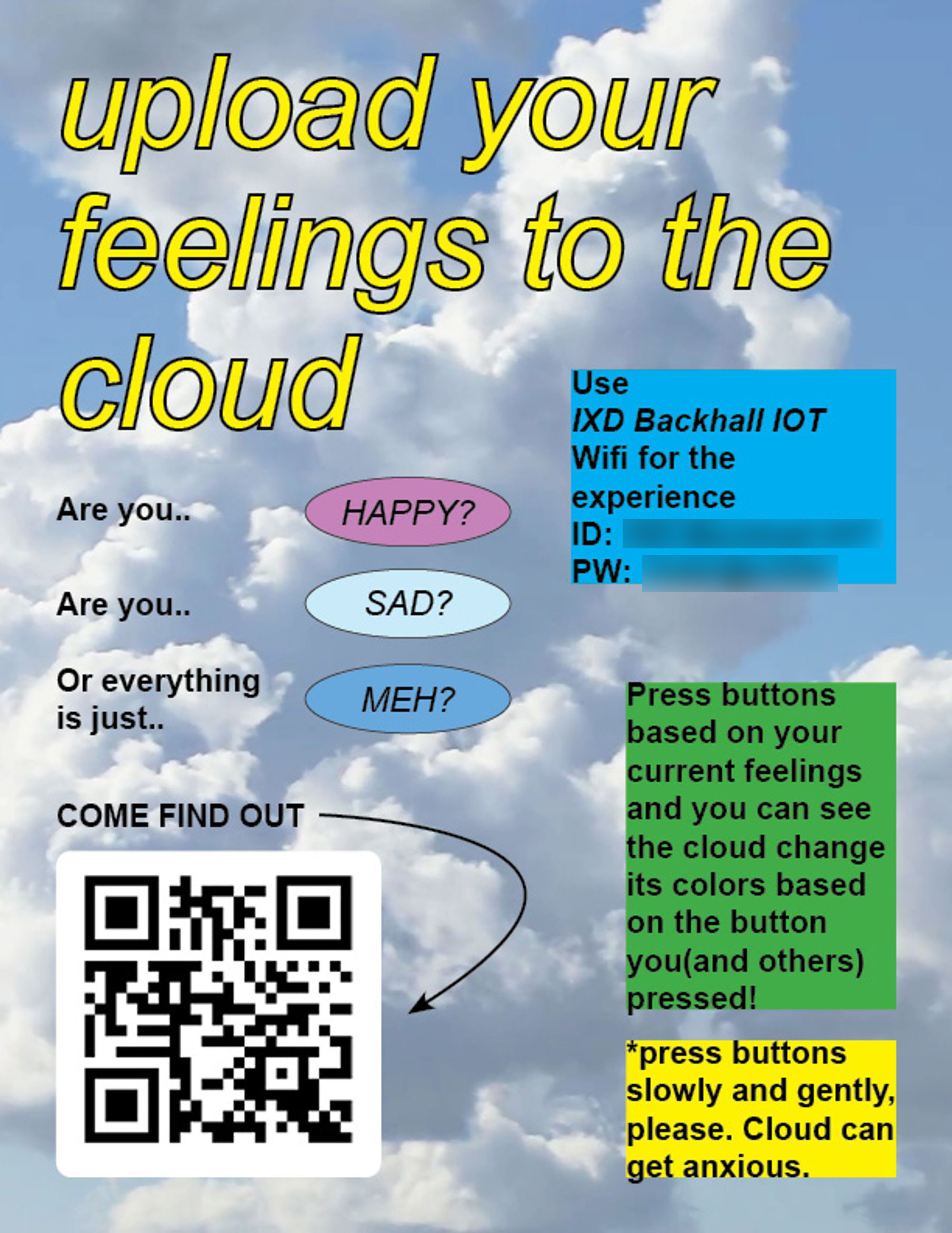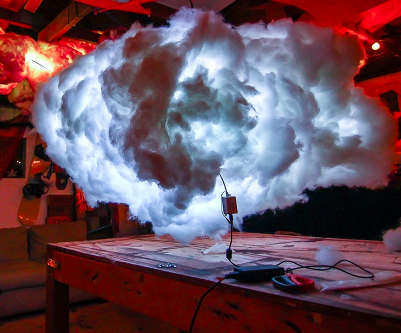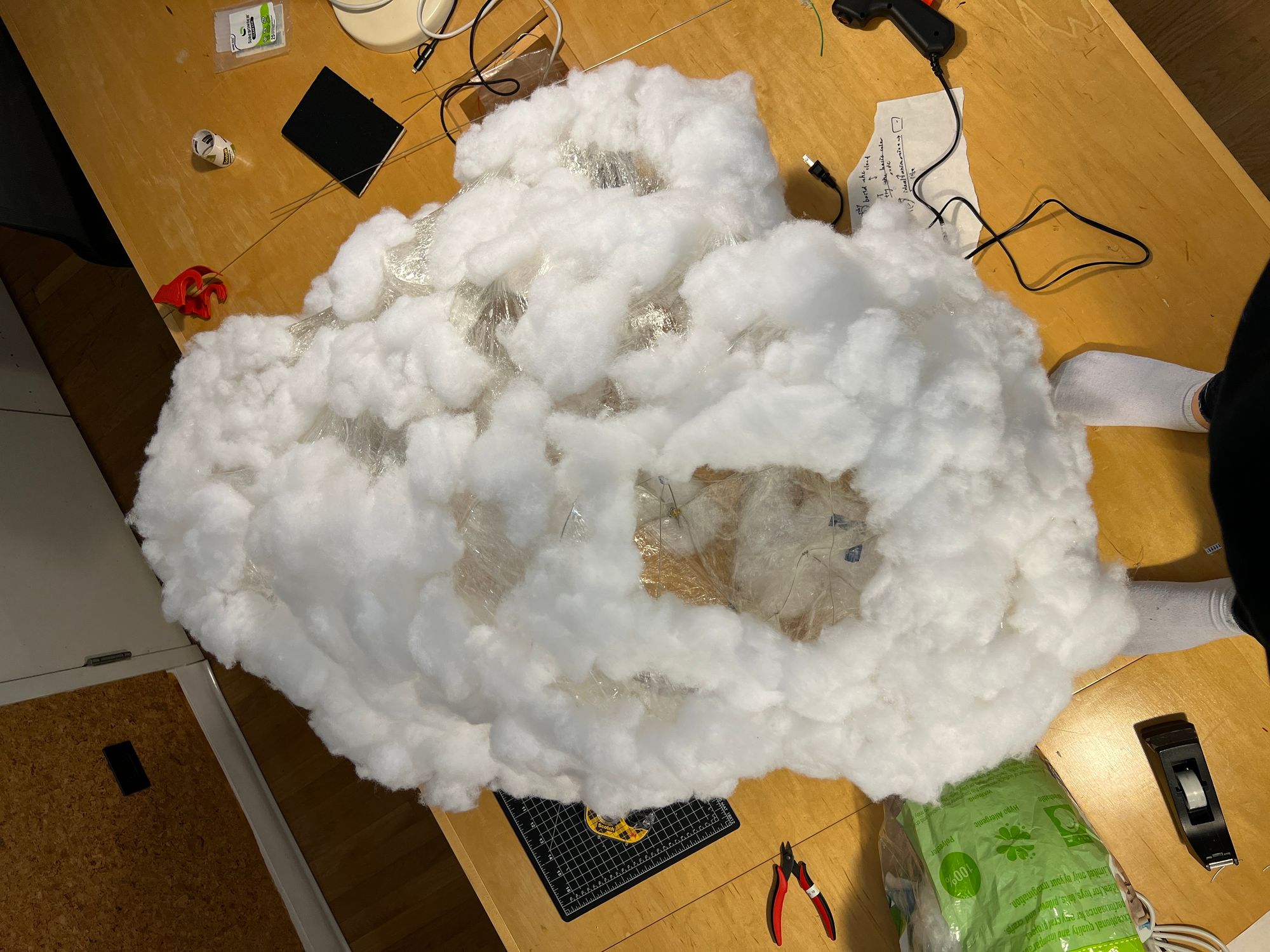 Using clear wrap, each area was wrapped to prevent the wires from touching the leads. The top of the cloud has holes for Arduino boards and wires to enter.