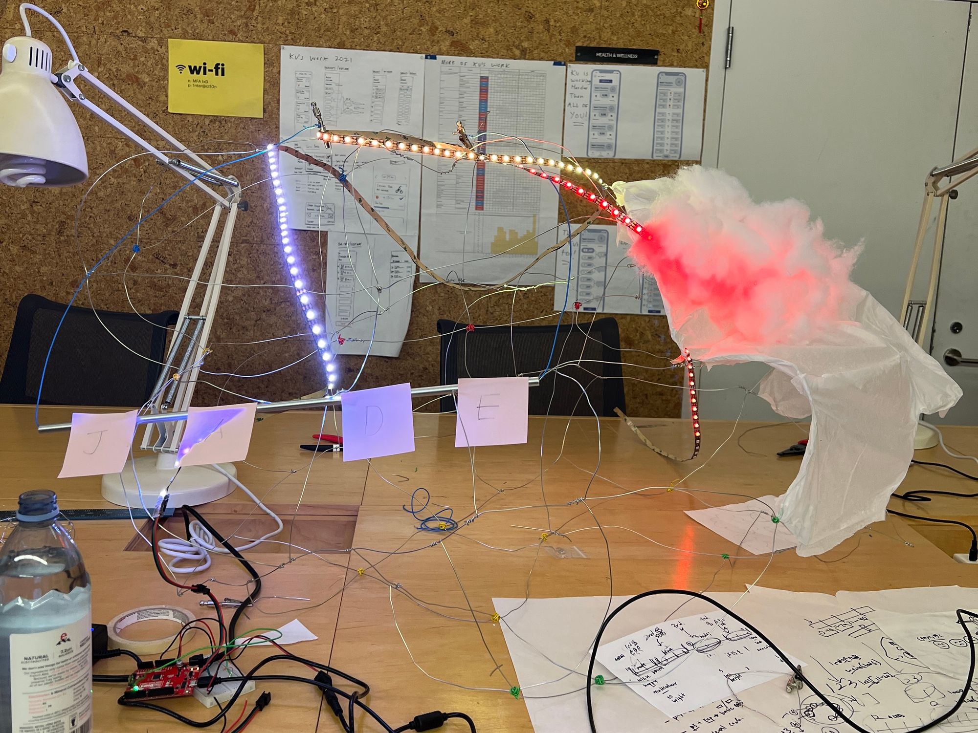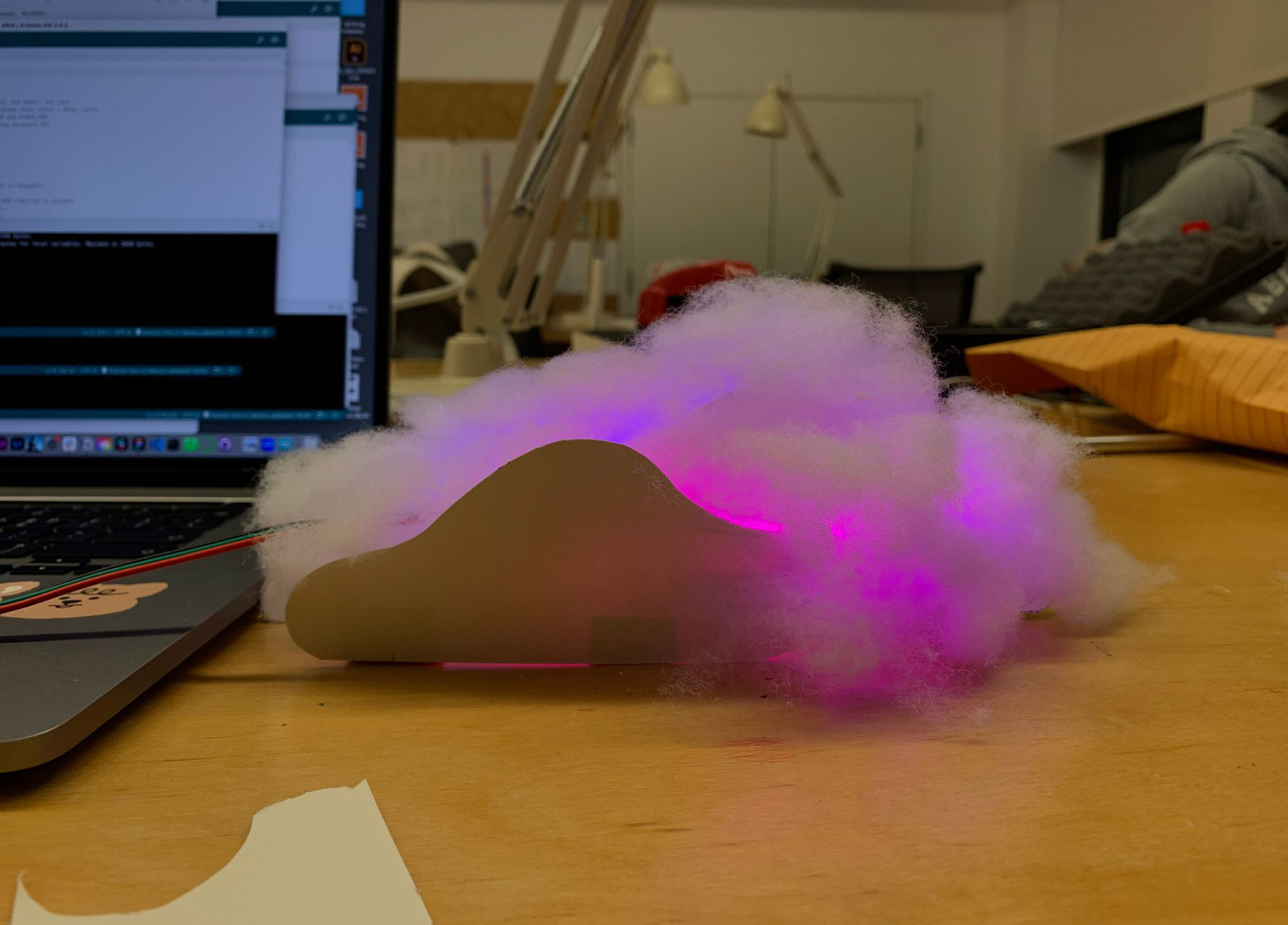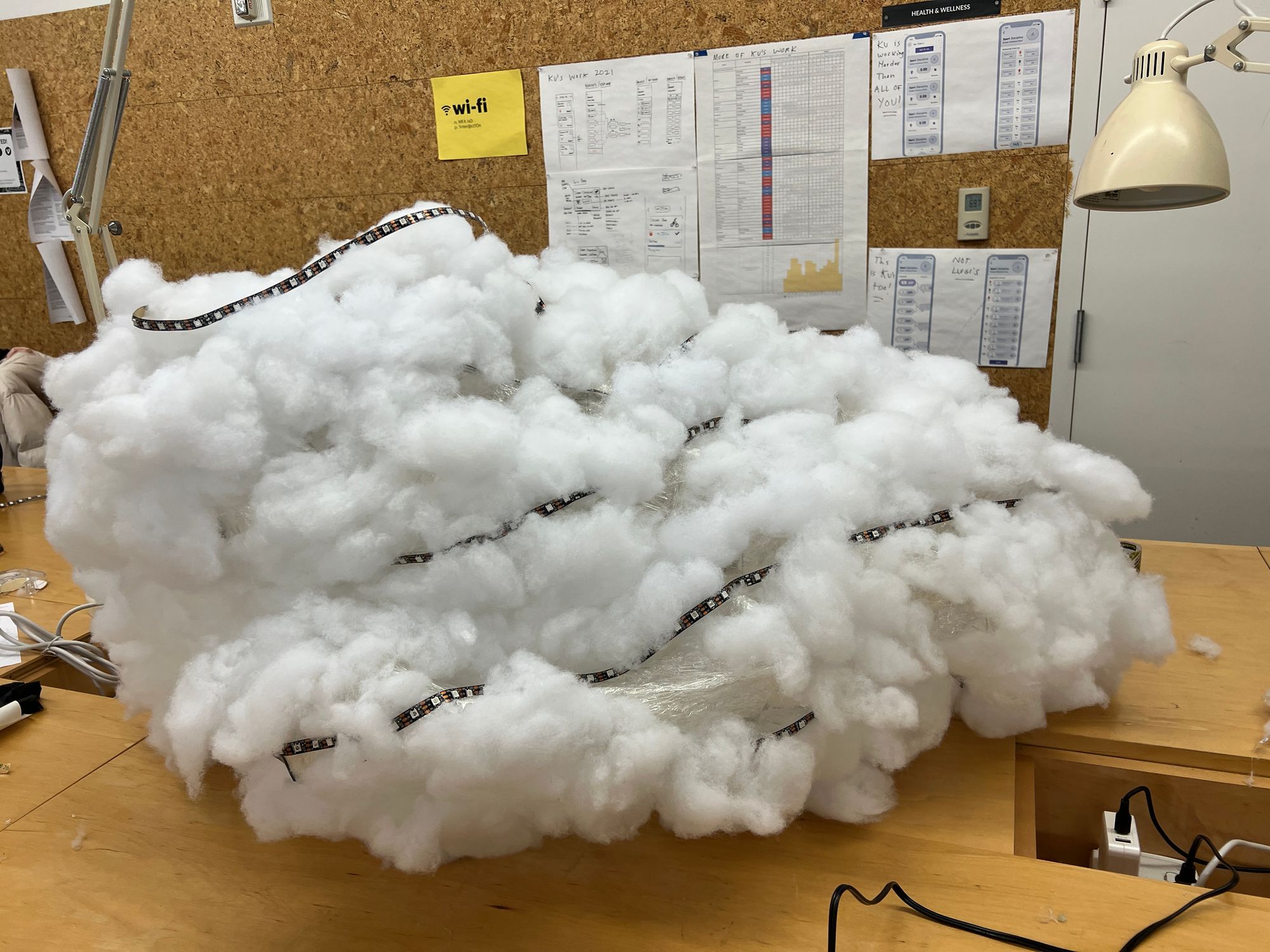 We designed a small version of cloud for testing LED and cotton material at the first. We used soft wire to make a prototype wire structure and put LED strips and cottons in advance.