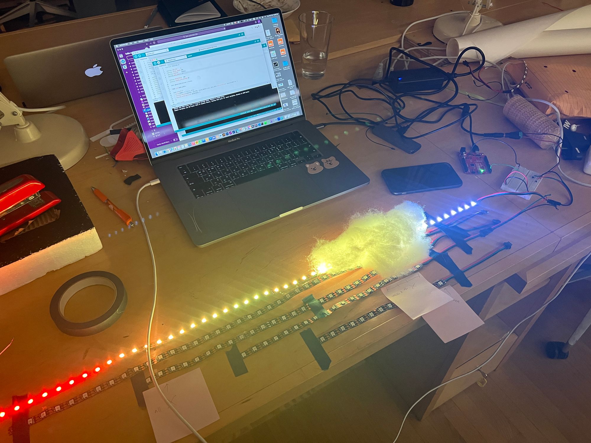 At about 80% finished, We ran the test again. Since the LED was covered with cotton, the brightness had to be adjusted, but since a large amount of LED was used(more than 700), it was modified while considering power and brightness at the same time.In addition, the demonstration day is in the morning, but it will be installed indoors, so we finished by checking the brightness when the lights were turned on and off.