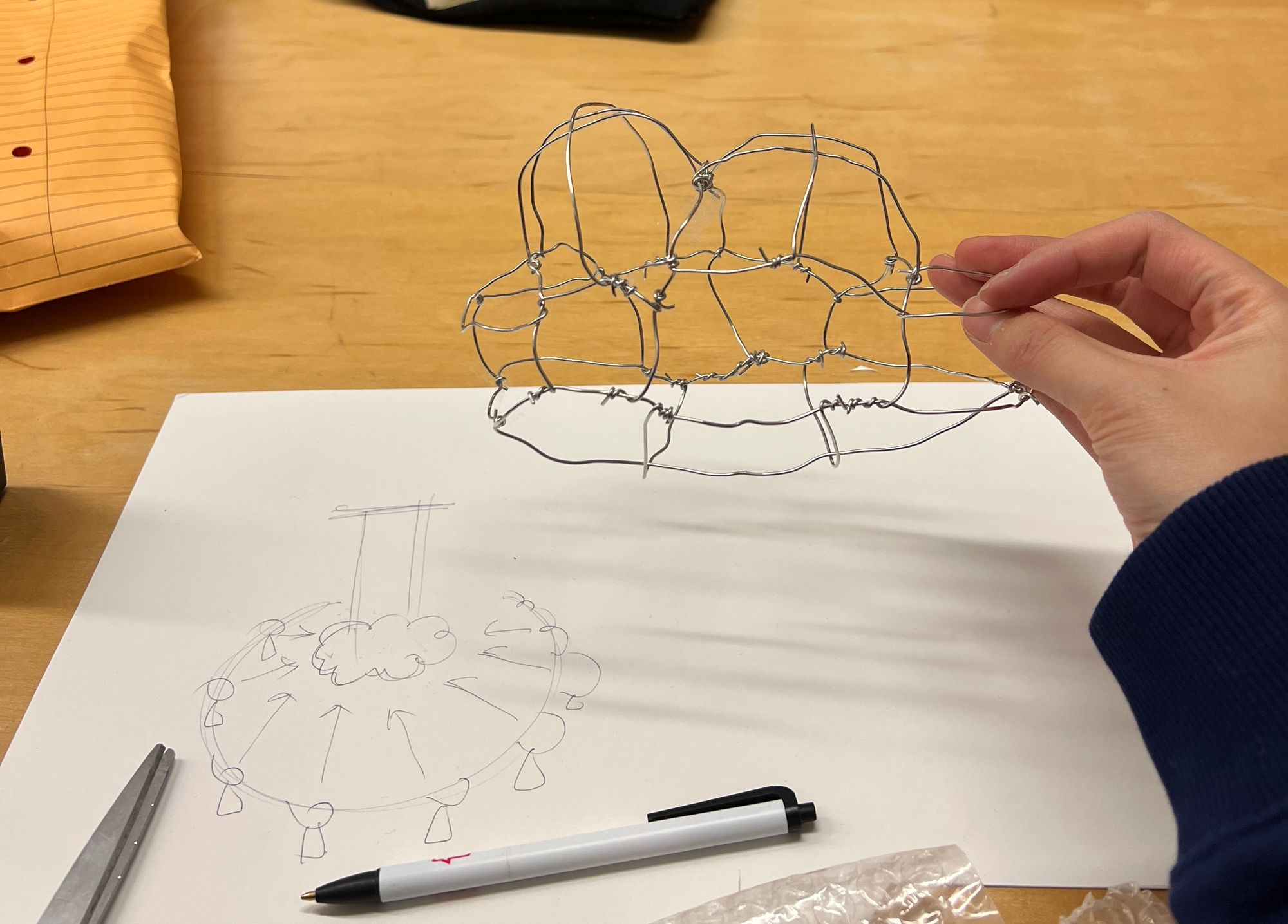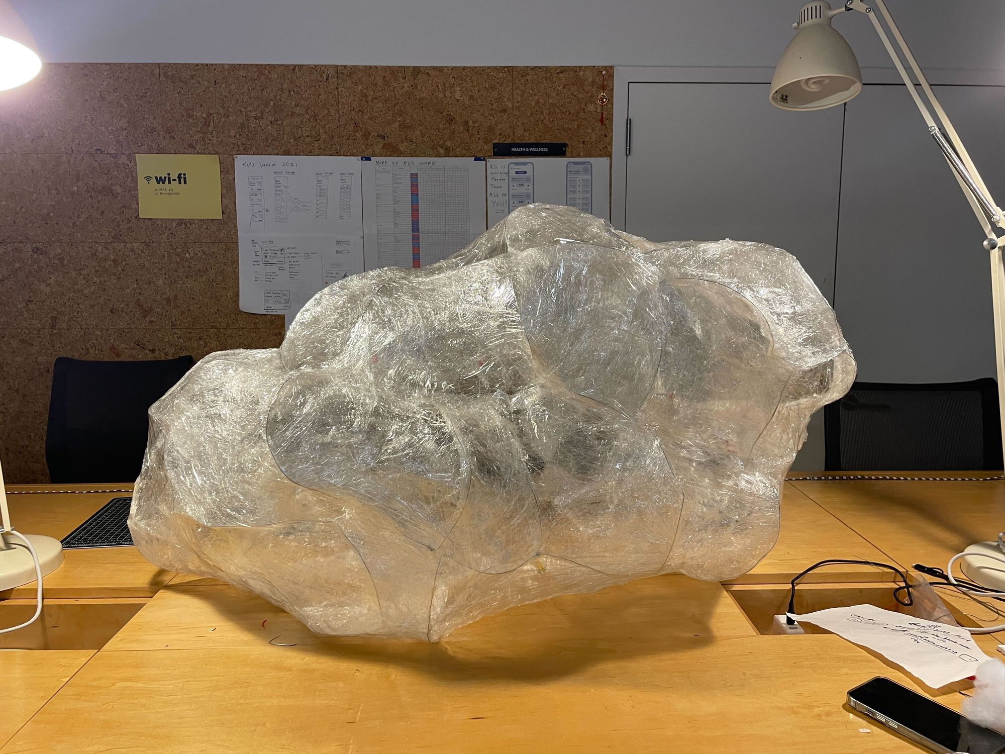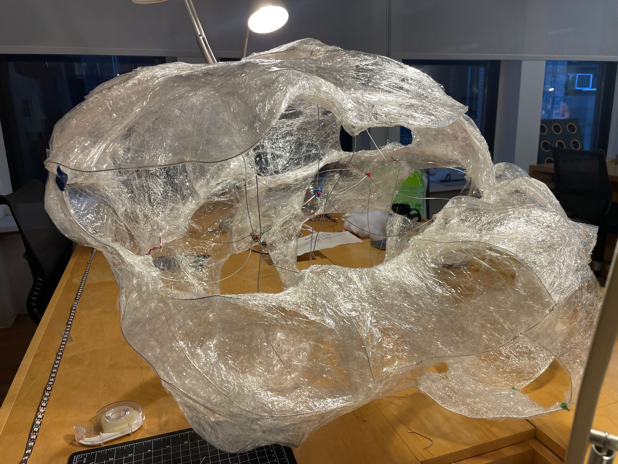 In the beginning, we designed a small version of cloud for testing LED and cotton materials. After making wire-frame, we changed the plan to use cleared wrap rather than paper.The reason of the using wrap is that paper was easy to teared and wires were not really stable so it cannot maintain the shapes. we took off all the paper and wrap the each section individually.
