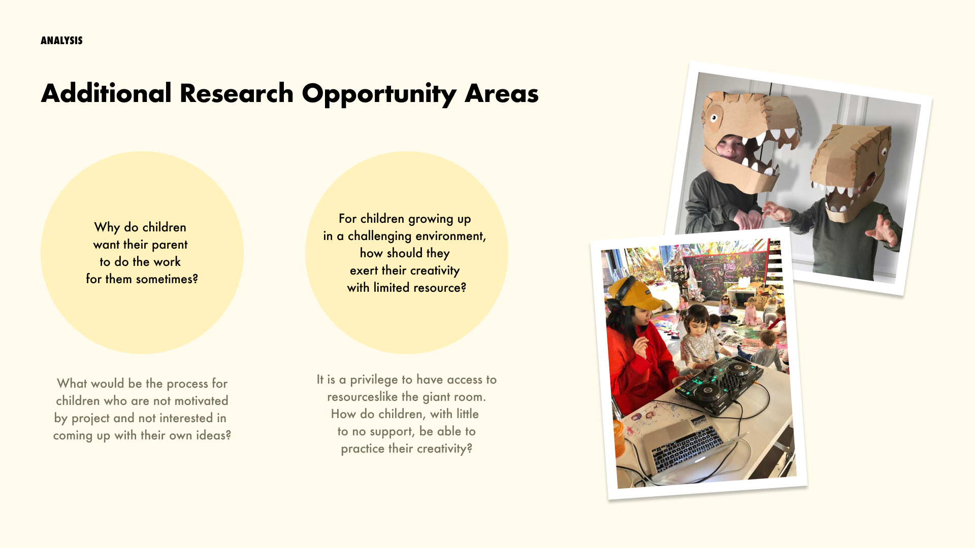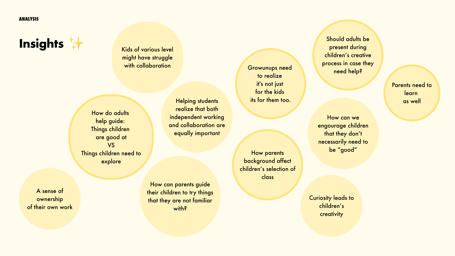 Even though parents try to respect children's own process of creative activity, their influence is still present and might drive children to focus on certain things without realizing. The factor that might come into play includes: parents' background, parent children relationship, parents' devotion in children's education, time spent together, etc.