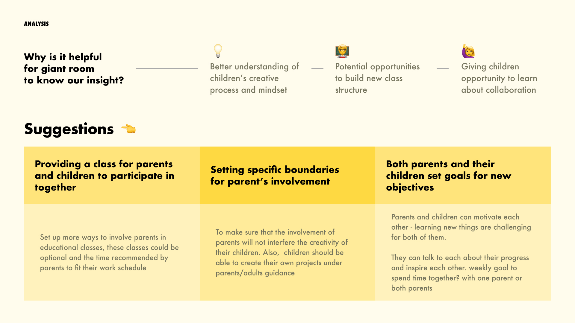 Both parent and instructor prefer not to interfere children or do the big parts for them when they are creating their own project. Parents who come to giant room respect children's freedom and will to create on their own. They believe that the best they will provide is guidance and suggestions.